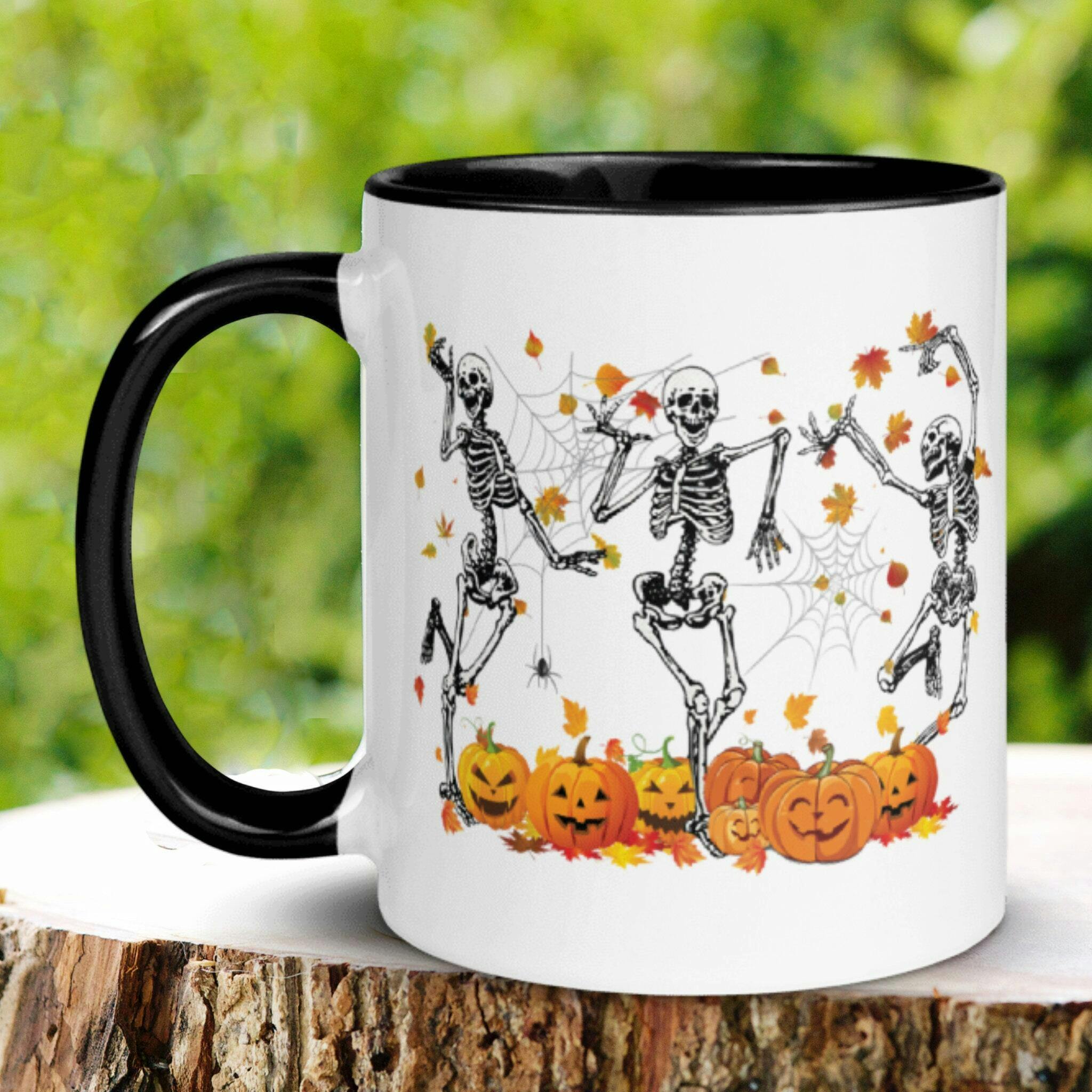 Dancing Skeleton Halloween Mug - This adorably spooky Dancing Skeleton Mug is the perfect Halloween accessory for those slightly eerie autumn mornings. Featuring an amusing design of playful skeletons dancing around a Halloween Pumpkin, it's sure to liven up any Halloween Party or Fall morning routine. This Halloween coffee mug is not just a fantastic Halloween Gift, but a great way to celebrate the holiday season in a fun and slightly creepy way. Entertain your guests or your Halloween teacher with this lovable, high-quality Halloween Cup.
